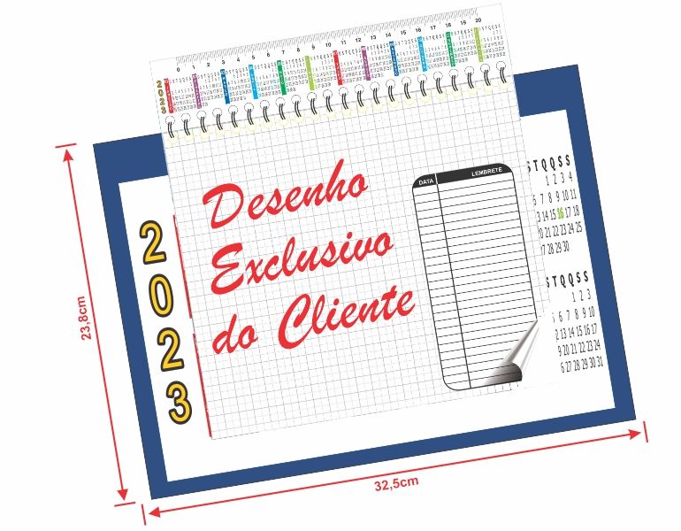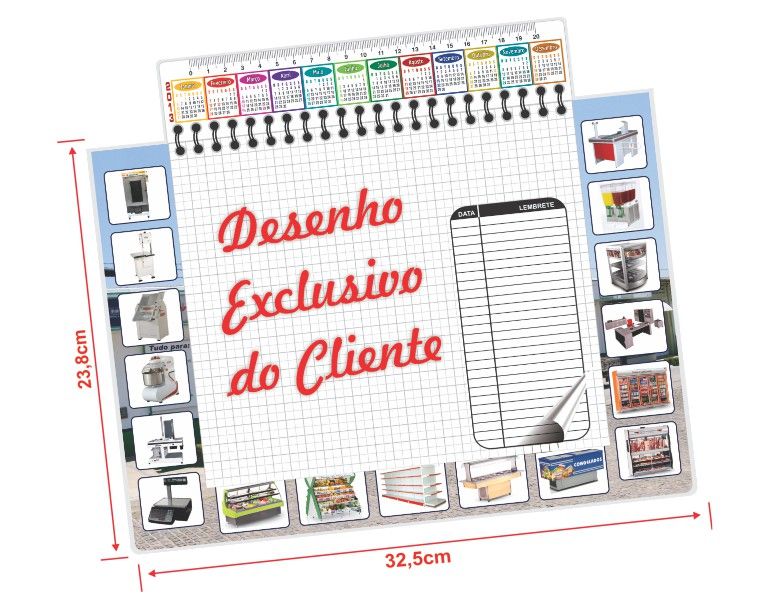 O Risque-rabisque Personalizado Hukyplast é composto por um bloco de 48 folhas (de 20,0 x 23,5 cm) para anotações encadernadas em Wire-0 e uma régua de 20 cm com calendário e espaço para publicidade. Tudo isso montado sobre uma base impressa no papel em offset e encapsulada em plástico rígido transparente. A base mede 32,5 x 23,8 cm.